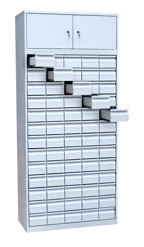 Шкаф ШК-65 оборудован двумя распашными, запираемыми на ключ, дверцами и 65 выдвижными ящиками на роликовых направляющих. Внутренние размеры ящиков — 85x115x400 мм.